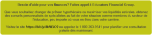 Depuis 1975, Educators Financial Group offre des services de planification financière et une vaste sélection de produits et services en matière de placement et de prêts financiers exclusivement aux membres du secteur de l’éducation et à leur famille. C’est cette solide expérience qui leur a permis de devenir les experts financiers du secteur de l’éducation, et d’offrir aux membres des solutions qui leur permettent de réaliser leurs objectifs financiers.