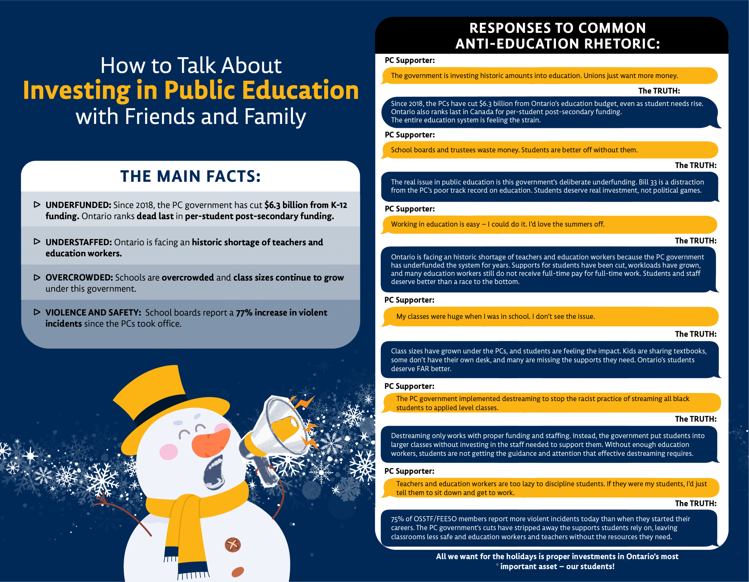 To support members in having clear, fact-based discussions, the Federation has once again prepared “How to Talk to Friends and Family” infographics, for K-12 education and post-secondary (in English and French) with key talking points and messaging. We hope these resources help spark meaningful conversations about the essential work of teachers and education workers in Ontario’s publicly funded education system.